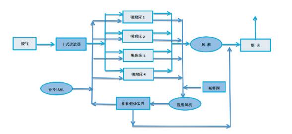 Specyfikacje zbiornika adsorpcyjnego i ilość ładunku adsorbentu są projektowane w zależności od objętości powietrza, aby zapewnić określoną prędkość gazu i czas przebywania, tak aby adsorbent mógł skutecznie i całkowicie wchłonąć rozpuszczalnik organiczny w gazie resztkowym. Zbiornik adsorpcyjny działa naprzemiennie, a stan pracy zbiornika adsorpcyjnego jest automatycznie przełączany przez system automatycznego sterowania PLC, aby naprzemiennie wykonywać trzy procesy adsorpcji, desorpcji, chłodzenia i suszenia i tak dalej.